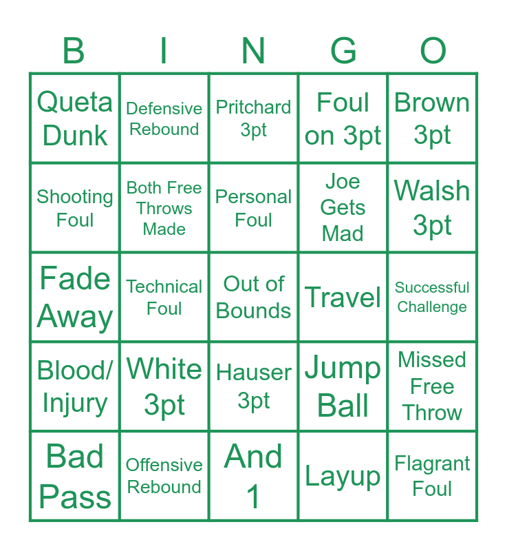 This bingo card has a free space and 24 words: White 3pt, Offensive Rebound, Personal Foul, Bad Pass, Brown 3pt, Queta Dunk, Shooting Foul, Defensive Rebound, Travel, Hauser 3pt, Joe Gets Mad, Fade Away, Jump Ball, Missed Free Throw, Both Free Throws Made, Layup, Successful Challenge, Pritchard 3pt, Walsh 3pt, Technical Foul, Flagrant Foul, Blood/ Injury, Foul on 3pt and And 1.