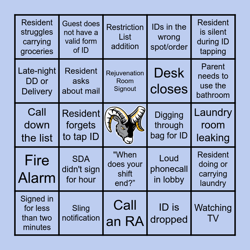 This bingo card has a free space and 49 words: Resident Forgot their ID, Watching TV, Homework, Call an RA, SDA didn't sign for hour, "Do you need anything?", Guest does not have a valid form of ID, Hole in Parietal, Late-night DD or Delivery, Lobby Party, Resident asks about mail, IDs in the wrong spot/order, Resident doing or carrying laundry, Loud phonecall in lobby, Awkward smile, Desk Phone Rings/Use Desk Phone, Rejuvenation Room Signout, Digging through bag for ID, Scan ID while resident is on a call, Resident is silent during ID tapping, Resident forgets to tap ID, ID is dropped, Resident struggles carrying groceries, Desk closes, Resident has a question, Parent needs to use the bathroom, Signed in for less than two minutes, Weed smell, "When does your shift end?”, Fire Alarm, Falling asleep, RA round, Lockout, Vending machine struggles, Sling notification, Signed for hour and then posted it, Write an IR, FSUPD enters building, Laundry room leaking, Noise Complaint, Forgot to get something before shift, People are in the lounge, Someone enters for a parking ticket, Exterminator enters the building, Call down the list, Restriction List addition, Restriction list removal, Reslife enters the building and You see your friend/coworker.