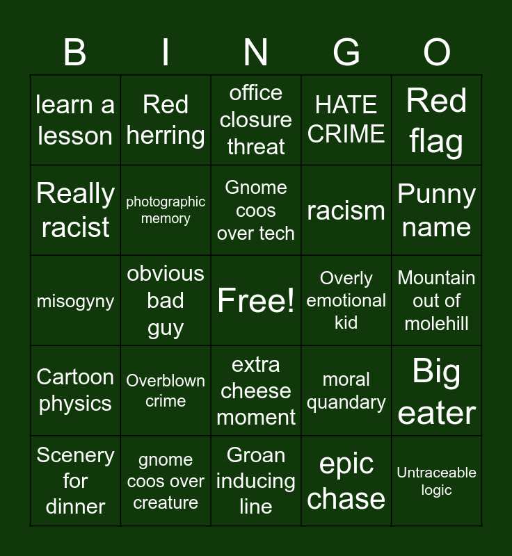 This bingo card has a free space and 31 words: Groan inducing line, bad accent, obvious bad guy, Cliche, learn a lesson, office closure threat, photographic memory, moral quandary, Overly emotional kid, epic chase, Mountain out of molehill, Untraceable logic, General incompetence, Impressive incompetence, Punny name, Redemption, Big eater, Overblown crime, Cartoon physics, extra cheese moment, Red flag, power of friendship, Scenery for dinner, Red herring, racism, Really racist, HATE CRIME, misogyny, gnome coos over creature, Gnome coos over tech and INCORRECT!.