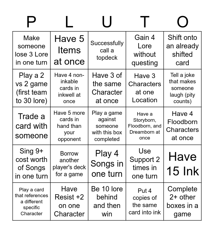 This bingo card has a free space and 65 words: Make 10 Lore in one turn, Banish 5 Characters in one turn (yours count), Win with 27+ Lore, Have 15 Ink, Have 6 Characters at once, Finish a game with 10- cards in deck, Have 5 Items at once, Play a match with the Chaos Wheel, Have 3 of the same Character at once, Have 4 Locations at once, Play 4 Songs in one turn, Play 4 Non-Song Actions in one turn, Have 4 Floodborn Characters at once, Shift onto an already shifted card, Play a game with 4+ players (not 2v2), Play a 2 vs 2 game (first team to 30 lore), Have 5 more cards in hand than your opponent, Make someone lose 3 Lore in one turn, Have 10 Characters in your discard pile, Have 3 Characters at one Location, Borrow another player's deck for a game, Sing 9+ cost worth of Songs in one turn, Gain 4 Lore without questing, Use a deck with 80+ cards, Use a deck with no duplicate cards, Use a deck with only Uncommon and Common cards, Add the whole pack to your deck (wrong colors are ink-only), Use a deck with only 1 ink color, Complete 2+ other boxes in a game, Make someone lose Lore while they have 0 Lore, Play a card that references a different specific Character, Have 3 Characters each with 1 remaining Willpower, Have a Character with 10+ Strength, Have 4+ different keywords in play at once, Use Support 2 times in one turn, Have Resist +2 on one Character, Don't use a Character for three turns, Trade a card with someone, Put 4 copies of the same card into ink, Have numbers 0-9 in play at the same time, Have 4 non-inkable cards in inkwell at once, Make a Character sing a Song they normally do, Have a Storyborn, Floodborn, and Dreamborn at once, Have a Hero and a Villain at once, Have a Character at a Location they normally are, Have 0 cards in hand by the end of turn 5, Tell a joke that makes someone laugh (pity counts), Play an action, location, and character in the same turn, Banish a character using one of that character's friends, Spend 5 Ink in one turn without playing a card, End your turn at exactly 19 lore, Have 10+ types in play, Remove 5 damage in a turn, Be 10 lore behind and then win, Have 2 Dual-Ink cards in play at once, End a turn with 9+ cards in hand, Banish a character that started the turn ready, Successfully call a topdeck, Finish a game with 5 or fewer Ink, Ask for "just one more turn" and be granted it, Finish a game without challenging, Remove 4 damage from characters in one turn, Have 2 Boosts under one card, Play 2 of the same card in one turn and Play the same named card 3 turns in a row.