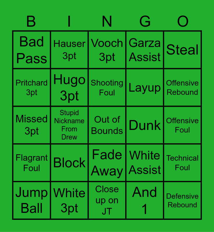 This bingo card has a free space and 24 words: Block, White 3pt, Shooting Foul, Jump Ball, Steal, Bad Pass, Pritchard 3pt, Hauser 3pt, Dunk, Fade Away, Layup, Missed 3pt, White Assist, Technical Foul, Hugo 3pt, And 1, Offensive Foul, Vooch 3pt, Offensive Rebound, Stupid Nickname From Drew, Defensive Rebound, Flagrant Foul, Garza Assist and Close up on JT.