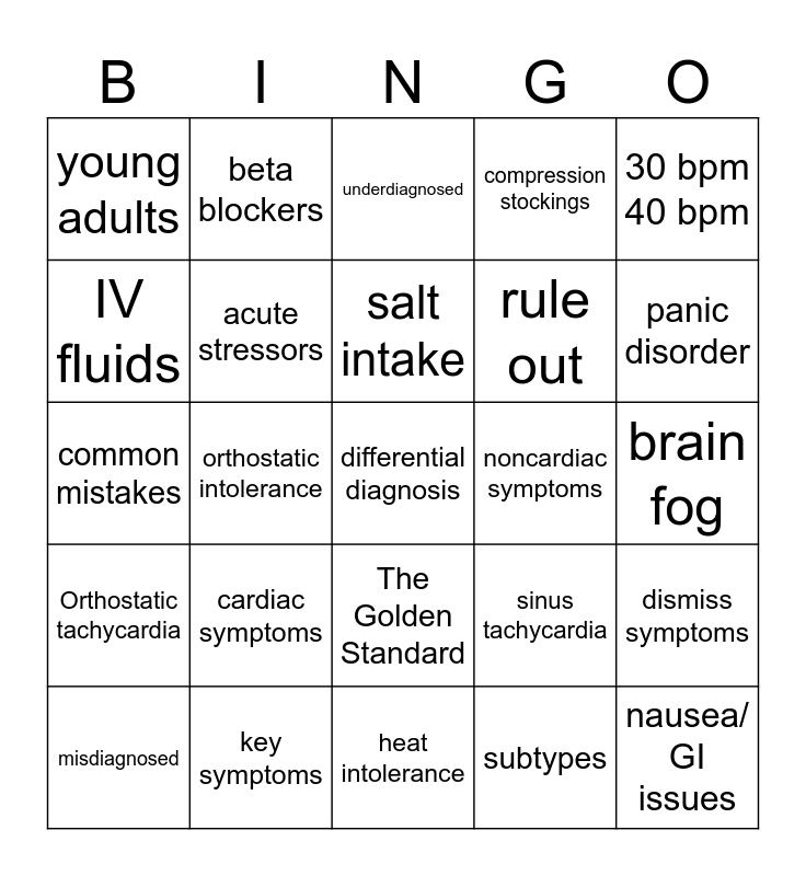 This bingo card has a free space and 29 words: misdiagnosed, dysautonomia, orthostatic intolerance, adolescents, young adults, underdiagnosed, acute stressors, cardiac symptoms, noncardiac symptoms, key symptoms, brain fog, nausea/ GI issues, heat intolerance, subtypes, panic disorder, near-syncope, The Golden Standard, Orthostatic tachycardia, 30 bpm 40 bpm, common mistakes, sinus tachycardia, imaging, rule out, IV fluids, compression stockings, beta blockers, dismiss symptoms, salt intake and communication.