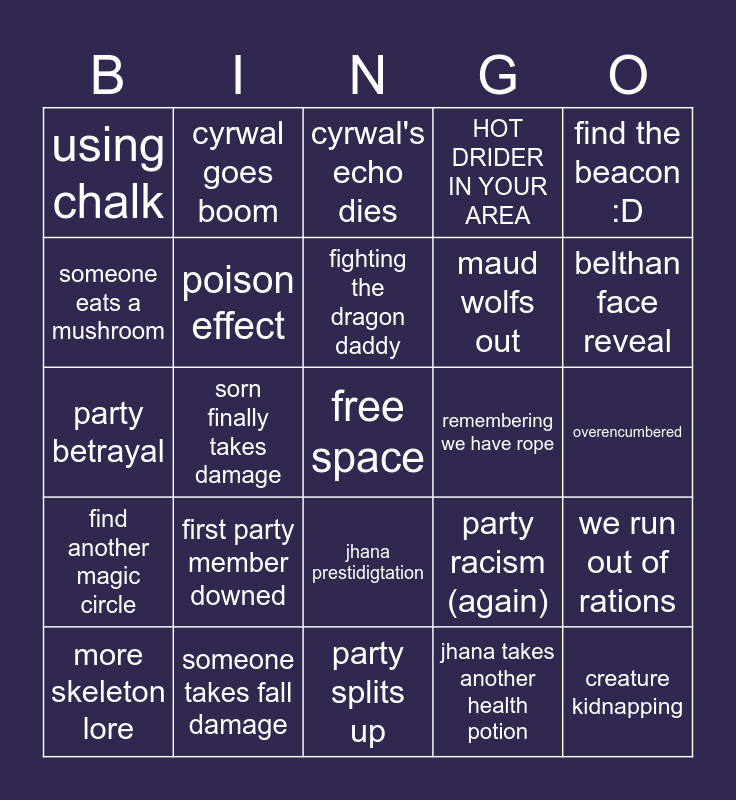 This bingo card has a free space and 24 words: first party member downed, someone takes fall damage, fighting the dragon daddy, more skeleton lore, find the beacon :D, using chalk, someone eats a mushroom, cyrwal goes boom, remembering we have rope, jhana prestidigtation, maud wolfs out, party betrayal, party racism (again), we run out of rations, poison effect, jhana takes another health potion, overencumbered, cyrwal's echo dies, belthan face reveal, sorn finally takes damage, creature kidnapping, find another magic circle, HOT DRIDER IN YOUR AREA and party splits up.