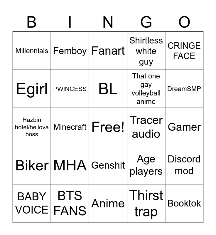 This bingo card has a free space and 24 words: MHA, BTS FANS, BL, BABY VOICE, CRINGE FACE, Millennials, Egirl, Femboy, Tracer audio, Genshit, That one gay volleyball anime, Hazbin hotel/hellova boss, Age players, Discord mod, PWINCESS, Thirst trap, Gamer, Fanart, DreamSMP, Minecraft, Booktok, Biker, Shirtless white guy and Anime.