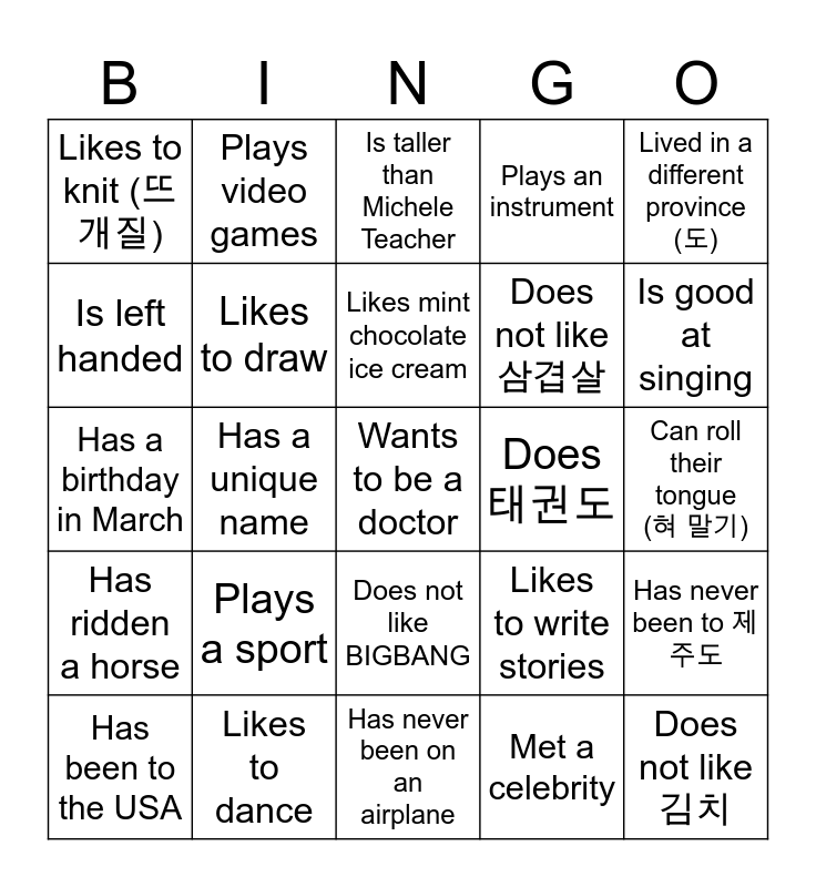 This bingo card has a free space and 24 words: Plays a sport, Likes to dance, Likes mint chocolate ice cream, Has been to the USA, Lived in a different province (도), Likes to knit (뜨개질), Is left handed, Plays video games, Does 태권도, Does not like BIGBANG, Does not like 삼겹살, Has a birthday in March, Likes to write stories, Has never been to 제주도, Likes to draw, Met a celebrity, Can roll their tongue (혀 말기), Is taller than Michele Teacher, Is good at singing, Has a unique name, Does not like 김치, Has ridden a horse, Plays an instrument and Has never been on an airplane.