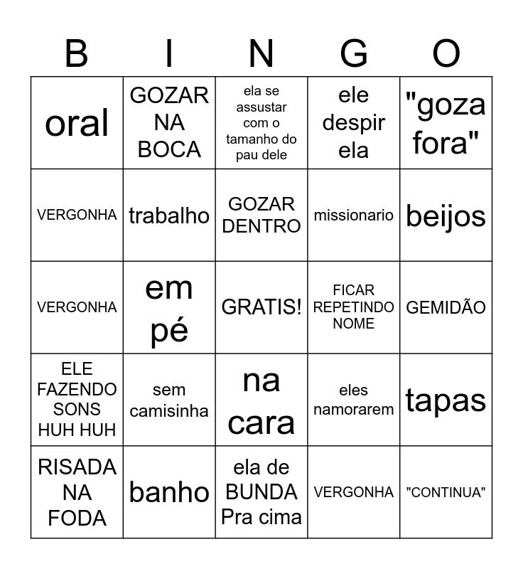 This bingo card has a free space and 24 words: sem camisinha, banho, GOZAR DENTRO, RISADA NA FODA, "goza fora", oral, VERGONHA, GOZAR NA BOCA, FICAR REPETINDO NOME, na cara, missionario, VERGONHA, eles namorarem, tapas, trabalho, VERGONHA, GEMIDÃO, ela se assustar com o tamanho do pau dele, beijos, em pé, "CONTINUA", ELE FAZENDO SONS HUH HUH, ele despir ela and ela de BUNDA Pra cima.