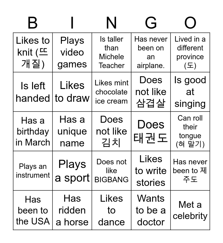 This bingo card has 25 words: Plays a sport, Likes to dance, Likes mint chocolate ice cream, Has been to the USA, Lived in a different province (도), Likes to knit (뜨개질), Is left handed, Plays video games, Does 태권도, Does not like BIGBANG, Does not like 삼겹살, Has a birthday in March, Likes to write stories, Has never been to 제주도, Likes to draw, Met a celebrity, Can roll their tongue (혀 말기), Is taller than Michele Teacher, Is good at singing, Has a unique name, Does not like 김치, Has ridden a horse, Plays an instrument, Has never been on an airplane. and Wants to be a doctor.