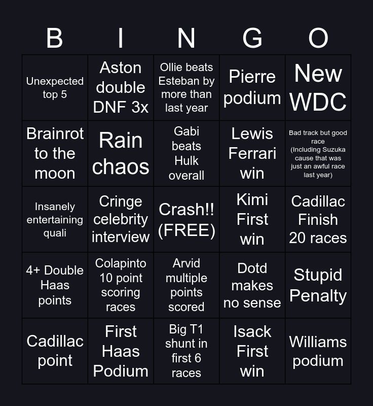 This bingo card has a free space and 24 words: Colapinto 10 point scoring races, First Haas Podium, Gabi beats Hulk overall, Cadillac point, New WDC, Unexpected top 5, Brainrot to the moon, Aston double DNF 3x, Kimi First win, Arvid multiple points scored, Lewis Ferrari win, Insanely entertaining quali, Dotd makes no sense, Stupid Penalty, Rain chaos, Isack First win, Cadillac Finish 20 races, Ollie beats Esteban by more than last year, Bad track but good race (Including Suzuka cause that was just an awful race last year), Cringe celebrity interview, Williams podium, 4+ Double Haas points, Pierre podium and Big T1 shunt in first 6 races.
