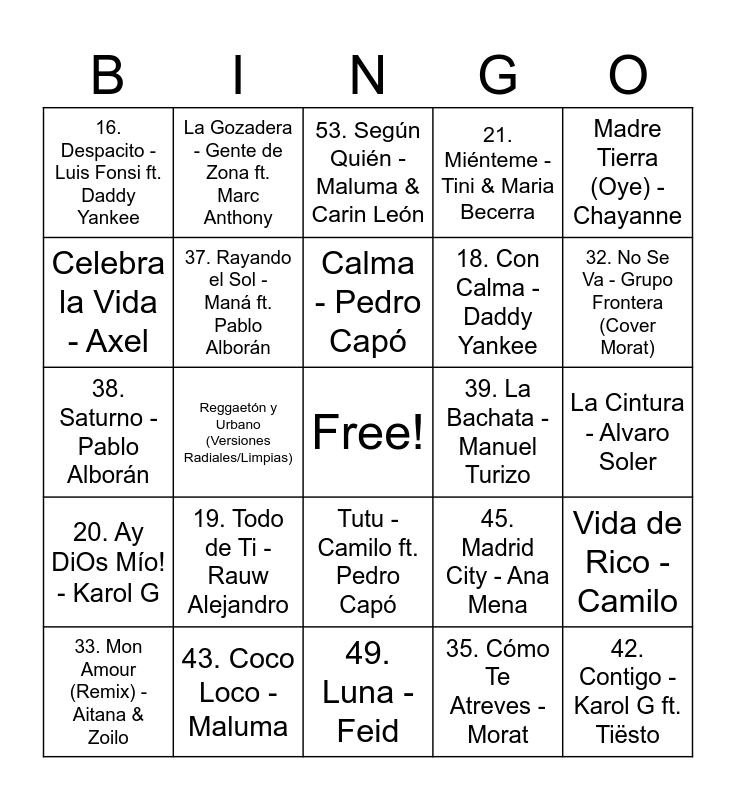 This bingo card has a free space and 64 words: Pop y Tropical, Vivir Mi Vida - Marc Anthony, La Bicicleta - Shakira & Carlos Vives, Vida de Rico - Camilo, Tacones Rojos - Sebastián Yatra, Robarte un Beso - Carlos Vives & Sebastián Yatra, La Gozadera - Gente de Zona ft. Marc Anthony, Bailando - Enrique Iglesias, Calma - Pedro Capó, Indigo - Camilo & Evaluna, Tutu - Camilo ft. Pedro Capó, Sophía - Alvaro Soler, La Cintura - Alvaro Soler, Madre Tierra (Oye) - Chayanne, Limbo - Daddy Yankee, Celebra la Vida - Axel, Reggaetón y Urbano (Versiones Radiales/Limpias), 16. Despacito - Luis Fonsi ft. Daddy Yankee, 17. Danza Kuduro - Don Omar, 18. Con Calma - Daddy Yankee, 19. Todo de Ti - Rauw Alejandro, 20. Ay DiOs Mío! - Karol G, 21. Miénteme - Tini & Maria Becerra, 22. Una Lady Como Tú - Manuel Turizo, 23. Criminal - Natti Natasha ft. Ozuna, 24. Ginza - J Balvin, 25. Échame la Culpa - Luis Fonsi & Demi Lovato (parte en español), 26. Súbeme la Radio - Enrique Iglesias, 27. Reggaetón Lento - CNCO, 28. Picky - Joey Montana, 29. Traicionera - Sebastián Yatra, 30. Me Niego - Reik ft. Ozuna & Wisin, Pop-Rock y Alternativo, 31. Ojos Marrones - Lasso, 32. No Se Va - Grupo Frontera (Cover Morat), 33. Mon Amour (Remix) - Aitana & Zoilo, 34. ¿A Dónde Vamos? - Morat, 35. Cómo Te Atreves - Morat, 36. Besos en Guerra - Morat & Juanes, 37. Rayando el Sol - Maná ft. Pablo Alborán, 38. Saturno - Pablo Alborán, 39. La Bachata - Manuel Turizo, 40. Hawaii - Maluma, Éxitos Recientes (2024-2026), 41. Puntería - Shakira, 42. Contigo - Karol G ft. Tiësto, 43. Coco Loco - Maluma, 44. Vagabundo - Sebastian Yatra, Manuel Turizo, 45. Madrid City - Ana Mena, 46. Las Babys - Aitana, 47. Cosas de la Peda - Prince Royce ft. Gabito Ballesteros, 48. El Jefe - Shakira, 49. Luna - Feid, 50. Quevedo: Bzrp Music Sessions, Vol. 52 (Quédate), 51. Un X100to - Grupo Frontera & Bad Bunny, 52. Primera Cita - Carin León, 53. Según Quién - Maluma & Carin León, 54. AM - Nio García, 55. Telepatía - Kali Uchis, 56. Todo de Ti - Rauw Alejandro, 57. Dakiti - Bad Bunny & Jhay Cortez, 58. Pepas - Farruko (Versión Edit), 59. Provenza - Karol G and 60. Despechá - Rosalía.