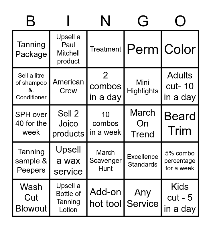 This bingo card has 25 words: Upsell a wax service, Add-on hot tool, 2 combos in a day, Wash Cut Blowout, Color, Tanning Package, Sell a litre of shampoo &. Conditioner, Upsell a Paul Mitchell product, March On Trend, March Scavenger Hunt, Mini Highlights, SPH over 40 for the week, Excellence Standards, 5% combo percentage for a week, American Crew, Kids cut - 5 in a day, Beard Trim, Treatment, Adults cut- 10 in a day, Sell 2 Joico products, 10 combos in a week, Upsell a Bottle of Tanning Lotion, Tanning sample & Peepers, Perm and Any Service.
