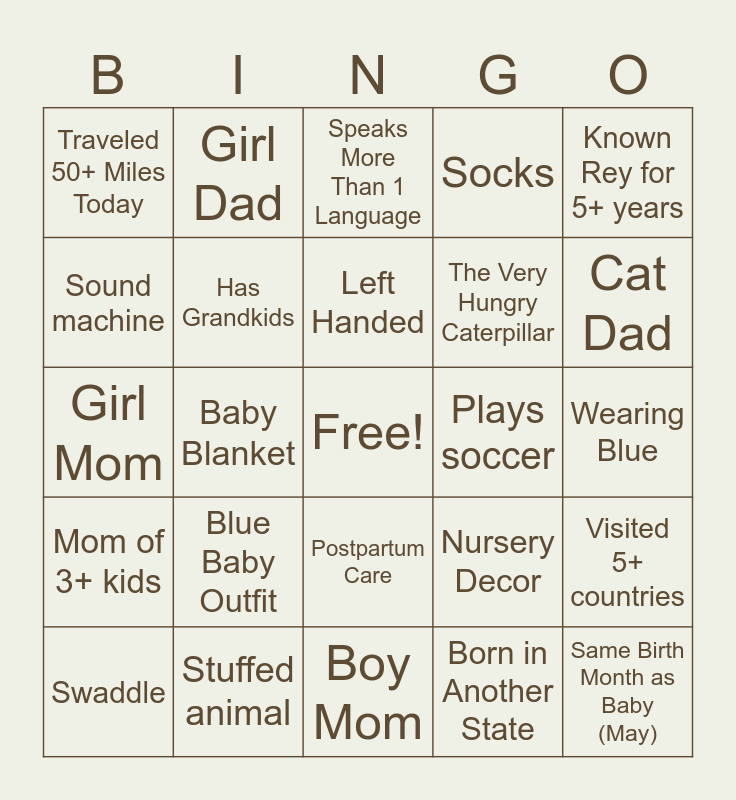 This bingo card has a free space and 29 words: Swaddle, Known Ethan for 5+ years, Baby Blanket, Dog Mom, Traveled 50+ Miles Today, Speaks More Than 1 Language, Has Grandkids, Blue Baby Outfit, Plays soccer, Stuffed animal, Wearing Blue, Same Birth Month as Baby (May), Boy Mom, Born in Another State, Cat Dad, Crib Bedding, Postpartum Care, Mom of 3+ kids, Known Rey for 5+ years, Girl Mom, Nursery Decor, Pregnant & Due Next Month, The Very Hungry Caterpillar, Sound machine, Socks, Girl Dad, Visited 5+ countries, Left Handed and Oldest sibling.
