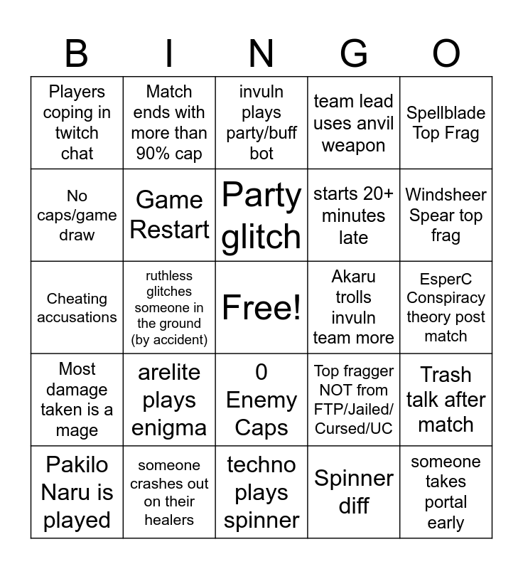 This bingo card has a free space and 24 words: arelite plays enigma, someone crashes out on their healers, Party glitch, Pakilo Naru is played, Spellblade Top Frag, Players coping in twitch chat, No caps/game draw, Match ends with more than 90% cap, Akaru trolls invuln team more, 0 Enemy Caps, starts 20+ minutes late, Cheating accusations, Top fragger NOT from FTP/Jailed/ Cursed/UC, Trash talk after match, Game Restart, Spinner diff, EsperC Conspiracy theory post match, invuln plays party/buff bot, Windsheer Spear top frag, ruthless glitches someone in the ground (by accident), someone takes portal early, Most damage taken is a mage, team lead uses anvil weapon and techno plays spinner.