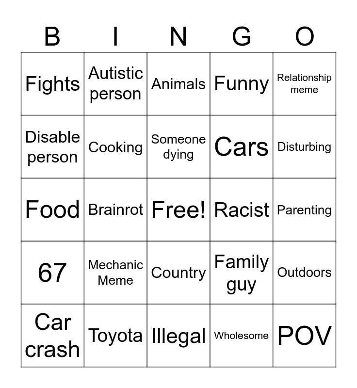 This bingo card has a free space and 24 words: Mechanic Meme, Toyota, Someone dying, Car crash, Relationship meme, Fights, Disable person, Autistic person, Racist, Country, Cars, Food, Family guy, Outdoors, Cooking, Wholesome, Parenting, Animals, Disturbing, Brainrot, POV, 67, Funny and Illegal.
