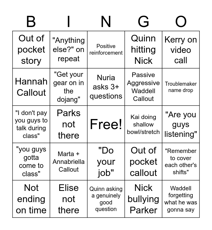 This bingo card has a free space and 24 words: Marta + Annabriella Callout, Elise not there, Nuria asks 3+ questions, Not ending on time, Kerry on video call, Out of pocket story, Hannah Callout, "Anything else?" on repeat, Kai doing shallow bowl/stretch, "Do your job", Passive Aggressive Waddell Callout, "I don't pay you guys to talk during class", Out of pocket callout, "Remember to cover each other's shifts", "Get your gear on in the dojang", Nick bullying Parker, "Are you guys listening", Positive reinforcement, Troublemaker name drop, Parks not there, Waddell forgetting what he was gonna say, "you guys gotta come to class", Quinn hitting Nick and Quinn asking a genuinely good question.