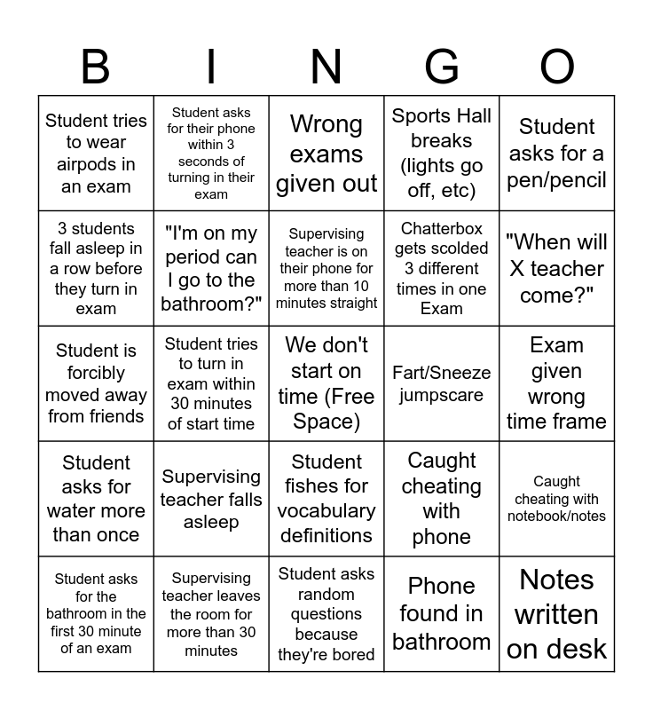 This bingo card has a free space and 24 words: Supervising teacher falls asleep, Supervising teacher leaves the room for more than 30 minutes, Supervising teacher is on their phone for more than 10 minutes straight, Student asks for the bathroom in the first 30 minute of an exam, Student asks for a pen/pencil, Student tries to wear airpods in an exam, 3 students fall asleep in a row before they turn in exam, Student asks for their phone within 3 seconds of turning in their exam, Fart/Sneeze jumpscare, Student fishes for vocabulary definitions, Chatterbox gets scolded 3 different times in one Exam, Student is forcibly moved away from friends, Caught cheating with phone, Caught cheating with notebook/notes, "I'm on my period can I go to the bathroom?", Phone found in bathroom, Exam given wrong time frame, Wrong exams given out, "When will X teacher come?", Student tries to turn in exam within 30 minutes of start time, Notes written on desk, Student asks for water more than once, Sports Hall breaks (lights go off, etc) and Student asks random questions because they're bored.