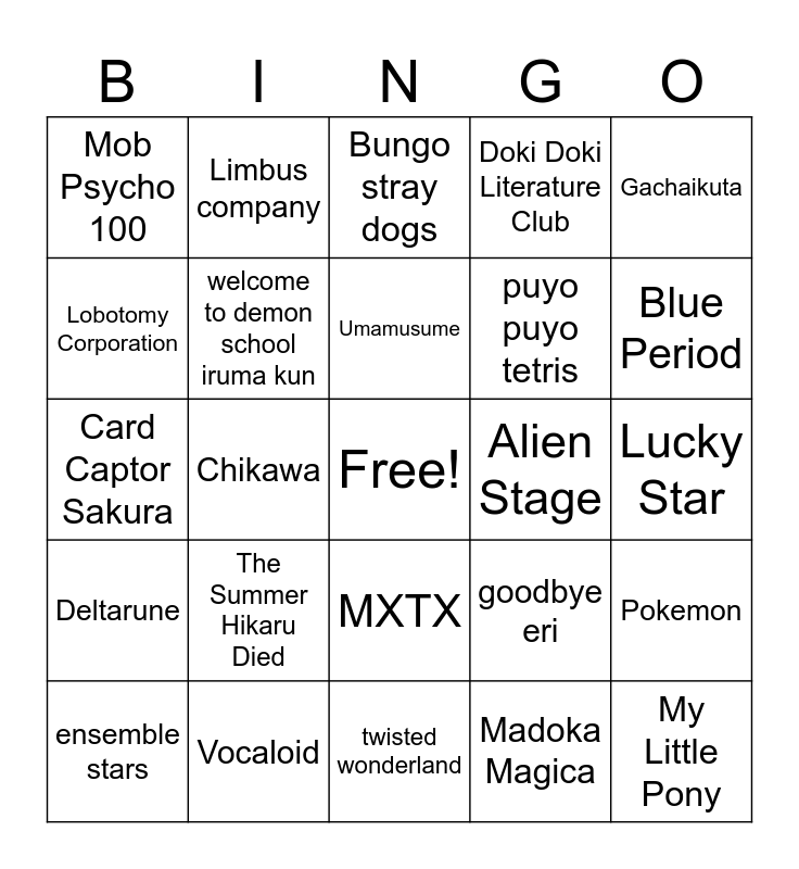 This bingo card has a free space and 24 words: The Summer Hikaru Died, Vocaloid, Umamusume, ensemble stars, Gachaikuta, Mob Psycho 100, Lobotomy Corporation, Limbus company, Alien Stage, MXTX, puyo puyo tetris, Card Captor Sakura, goodbye eri, Pokemon, welcome to demon school iruma kun, Madoka Magica, Lucky Star, Bungo stray dogs, Blue Period, Chikawa, My Little Pony, Deltarune, Doki Doki Literature Club and twisted wonderland.