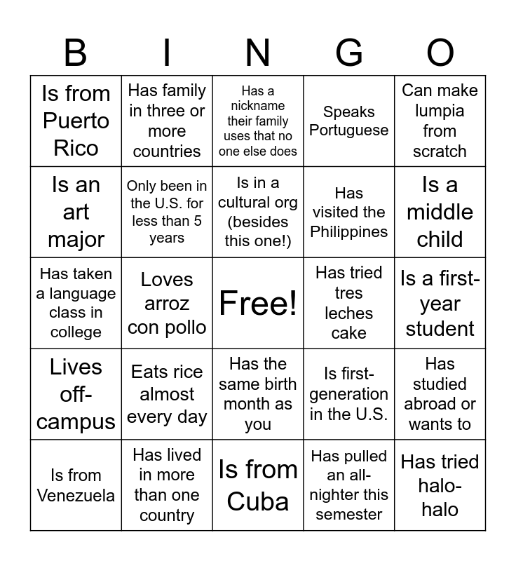 This bingo card has a free space and 55 words: A Nursing Major, Is from Venezuela, Is from Columbia, Is from Puerto Rico, Is from Cuba, Is from Mexico, Only been in the U.S. for less than 5 years, Has visited a country in Latin America, Has visited the Philippines, Speaks Spanish, Speaks Portuguese, Speaks Tagalog (Filipino), Speaks another Philippine language, Can name all the colors in the Mexican flag, Knows what “Quinceañera” is, Has tried balut, Can make lumpia from scratch, Loves arroz con pollo, Has made homemade tortillas, Has tried halo-halo, Has tried tres leches cake, Has family in more than one country, Is first-generation in the U.S., Has a nickname their family uses that no one else does, Grew up in a big family (5+ siblings or cousins close by!), Is in a cultural org (besides this one!), Has pulled an all-nighter this semester, Is a STEM major, Is a first-year student, Has studied abroad or wants to, Is a double major, Has changed their major at least once, Is pre-med, pre-law, or pre-health, Is in engineering or computer science, Is an art major, Has taken a language class in college, Has taken a class about Latin American or Filipino history, Lives off-campus, Is mixed (two or more cultures), Grew up celebrating both Latin American and Filipino traditions, Has family in three or more countries, Has a Spanish last name but isn’t Latino, Has a Filipino last name people mispronounce, Has been mistaken for another ethnicity, Eats rice almost every day, Has lived in more than one country, Has moved at least 3 times, Is the oldest sibling, Is the youngest sibling, Is a middle child, Is into anime, Is into gym/fitness, Has the same major as you, Has the same birth month as you and Is new to this club.