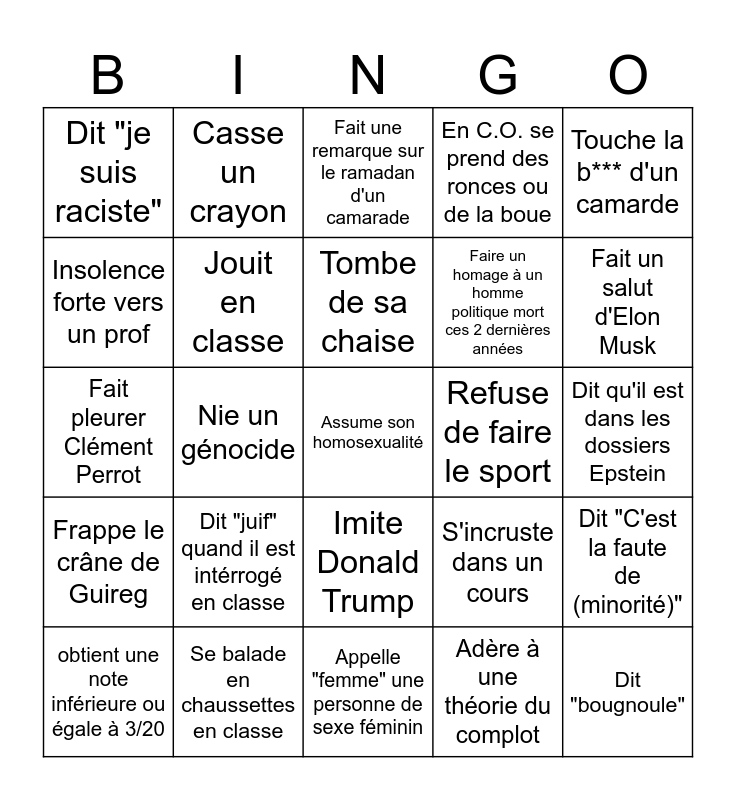 This bingo card has a free space and 24 words: Dit "juif" quand il est intérrogé en classe, Se balade en chaussettes en classe, Tombe de sa chaise, obtient une note inférieure ou égale à 3/20, Touche la b*** d'un camarde, Dit "je suis raciste", Insolence forte vers un prof, Casse un crayon, Refuse de faire le sport, Imite Donald Trump, Faire un homage à un homme politique mort ces 2 dernières années, Fait pleurer Clément Perrot, S'incruste dans un cours, Dit "C'est la faute de (minorité)", Jouit en classe, Adère à une théorie du complot, Dit qu'il est dans les dossiers Epstein, Fait une remarque sur le ramadan d'un camarade, Fait un salut d'Elon Musk, Nie un génocide, Dit "bougnoule", Frappe le crâne de Guireg, En C.O. se prend des ronces ou de la boue and Appelle "femme" une personne de sexe féminin.