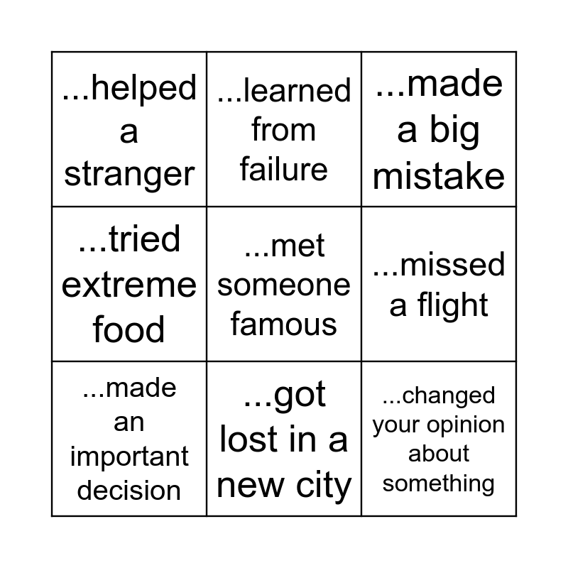 This bingo card has a free space and 8 words: ...missed a flight, ...made a big mistake, ...learned from failure, ...made an important decision, ...helped a stranger, ...changed your opinion about something, ...tried extreme food and ...got lost in a new city.
