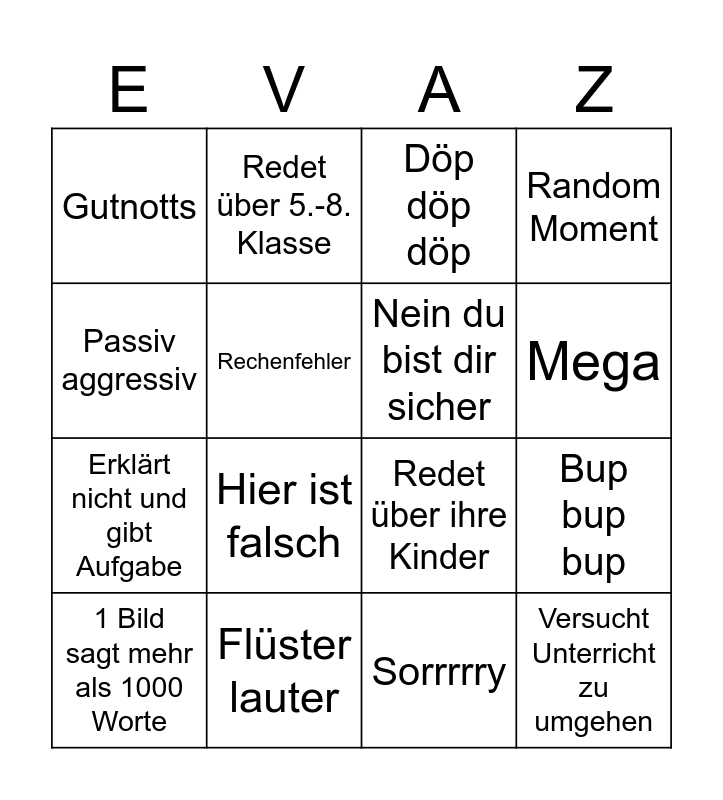 This bingo card has 16 words: Flüster lauter, Bup bup bup, Döp döp döp, Gutnotts, Erklärt nicht und gibt Aufgabe, Redet über 5.-8. Klasse, Redet über ihre Kinder, Sorrrrry, Passiv aggressiv, Rechenfehler, 1 Bild sagt mehr als 1000 Worte, Random Moment, Hier ist falsch, Mega, Nein du bist dir sicher and Versucht Unterricht zu umgehen.