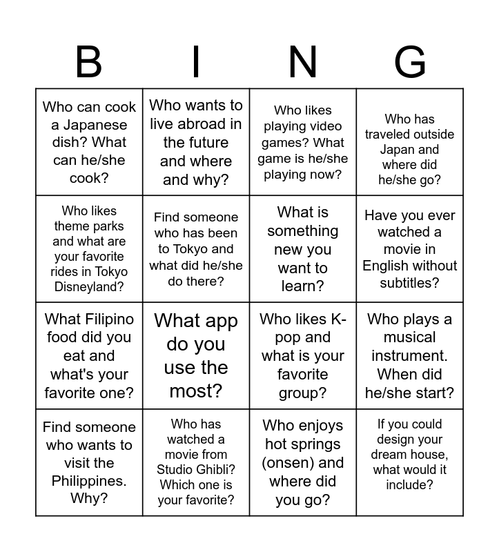 This bingo card has 16 words: Who has watched a movie from Studio Ghibli? Which one is your favorite?, Who plays a musical instrument. When did he/she start?, Who likes playing video games? What game is he/she playing now?, Who can cook a Japanese dish? What can he/she cook?, What Filipino food did you eat and what's your favorite one?, Who wants to live abroad in the future and where and why?, Who likes K-pop and what is your favorite group?, Who enjoys hot springs (onsen) and where did you go?, Who likes theme parks and what are your favorite rides in Tokyo Disneyland?, Find someone who has been to Tokyo and what did he/she do there?, Find someone who wants to visit the Philippines. Why?, Who has traveled outside Japan and where did he/she go?, What app do you use the most?, Have you ever watched a movie in English without subtitles?, What is something new you want to learn? and If you could design your dream house, what would it include?.