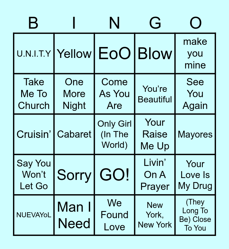 This bingo card has 51 words: Free!, Only Girl (In The World), Don’t Stop The Music, We Found Love, Sorry, Confident, Yellow, Viva La Vida, Take Me To Church, This Love, One More Night, Blow, Your Love Is My Drug, Livin’ On A Prayer, Genesis, Smells Like Teen Spirit, Come As You Are, Your Raise Me Up, Ring of Fire, make you mine, Cabaret, New York, New York, U.N.I.T.Y, You’re Beautiful, How Am I Supposed to Live Without You, (They Long To Be) Close To You, See You Again, DtMF, NUEVAYoL, EoO, Waterfalls, Unpretty, On & On, Feeling Good, good 4 u, Man I Need, So Easy (To Fall In Love), The Subway, Good Luck, Babe!, Señorita, Mayores, Say You Won’t Let Go, Heartbreak Anniversary, Kiss from a Rose, Put Your Records On, Walk On the Wild Side, Cruisin’, 1979, My Sweet Lord, GO! and golden hour.