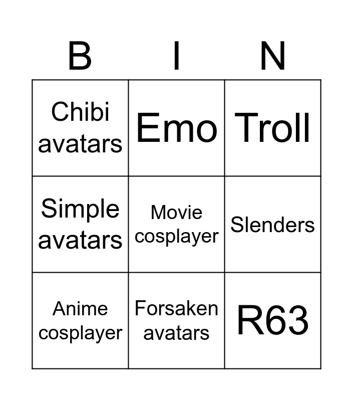 This bingo card has a free space and 8 words: Slenders, Troll, Emo, Anime cosplayer, Chibi avatars, R63, Simple avatars and Forsaken avatars.