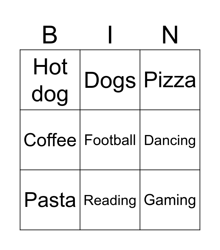 This bingo card has a free space and 8 words: Dancing, Pizza, Dogs, Pasta, Hot dog, Gaming, Coffee and Reading.