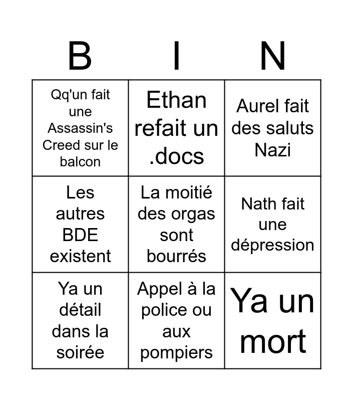 This bingo card has a free space and 8 words: Nath fait une dépression, Aurel fait des saluts Nazi, Ethan refait un .docs, Ya un détail dans la soirée, Qq'un fait une Assassin's Creed sur le balcon, Ya un mort, Les autres BDE existent and Appel à la police ou aux pompiers.