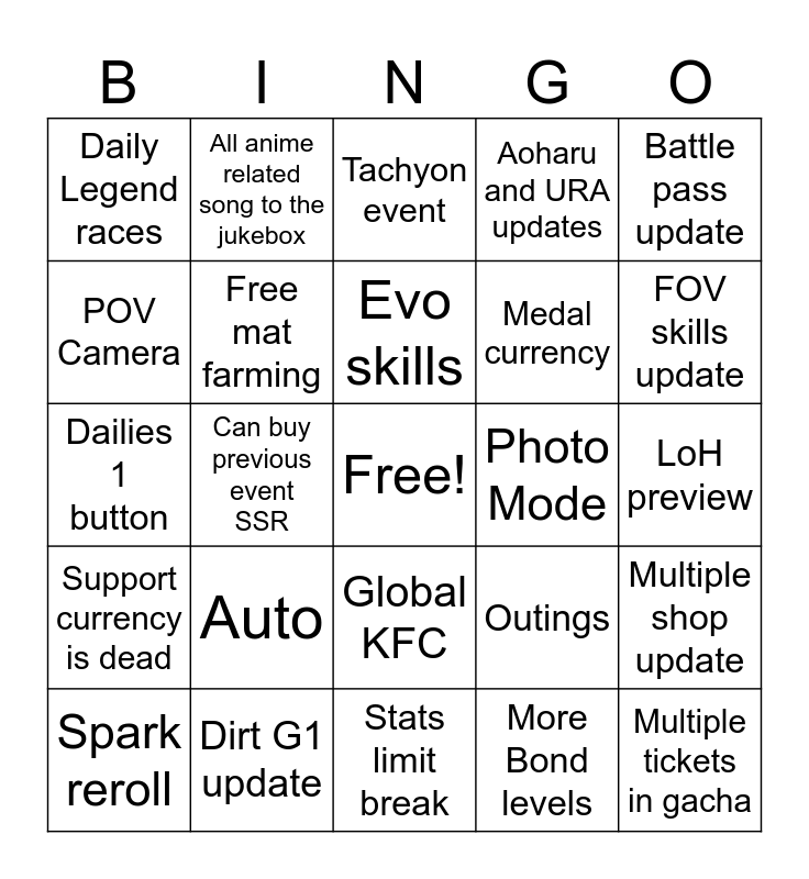 This bingo card has a free space and 24 words: Auto, Dirt G1 update, Evo skills, Spark reroll, Battle pass update, Daily Legend races, POV Camera, All anime related song to the jukebox, Photo Mode, Global KFC, Medal currency, Dailies 1 button, Outings, Multiple shop update, Free mat farming, More Bond levels, LoH preview, Tachyon event, FOV skills update, Can buy previous event SSR, Multiple tickets in gacha, Support currency is dead, Aoharu and URA updates and Stats limit break.