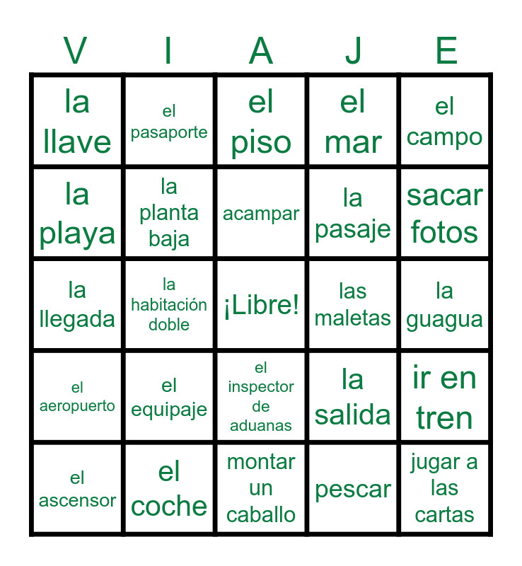 This bingo card has a free space and 29 words: el ascensor, la cama, la habitación doble, el huésped, la llave, el piso, la planta baja, el equipaje, las maletas, el coche, la guagua, jugar a las cartas, montar un caballo, pescar, sacar fotos, los viajeros, el inspector de aduanas, el aeropuerto, el campo, la llegada, la salida, el paisaje, la pasaje, la playa, el mar, el pasaporte, ir en tren, acampar and ir de vacaciones.