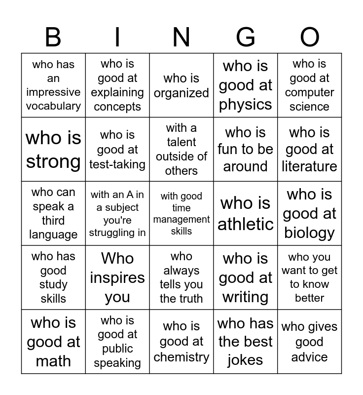 This bingo card has 25 words: Who inspires you, who is good at chemistry, with a talent outside of others, who is good at math, who is good at computer science, who has an impressive vocabulary, who is strong, who is good at explaining concepts, who is athletic, who always tells you the truth, who is fun to be around, who can speak a third language, who is good at writing, who you want to get to know better, who is good at test-taking, who gives good advice, who is good at biology, who is organized, who is good at literature, with an A in a subject you're struggling in, with good time management skills, who is good at public speaking, who has good study skills, who is good at physics and who has the best jokes.