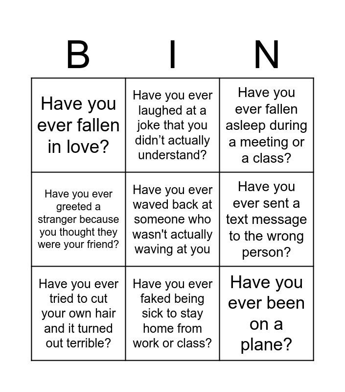This bingo card has a free space and 8 words: Have you ever greeted a stranger because you thought they were your friend?, Have you ever laughed at a joke that you didn’t actually understand?, Have you ever sent a text message to the wrong person?, Have you ever tried to cut your own hair and it turned out terrible?, Have you ever fallen asleep during a meeting or a class?, Have you ever fallen in love?, Have you ever faked being sick to stay home from work or class? and Have you ever been on a plane?.