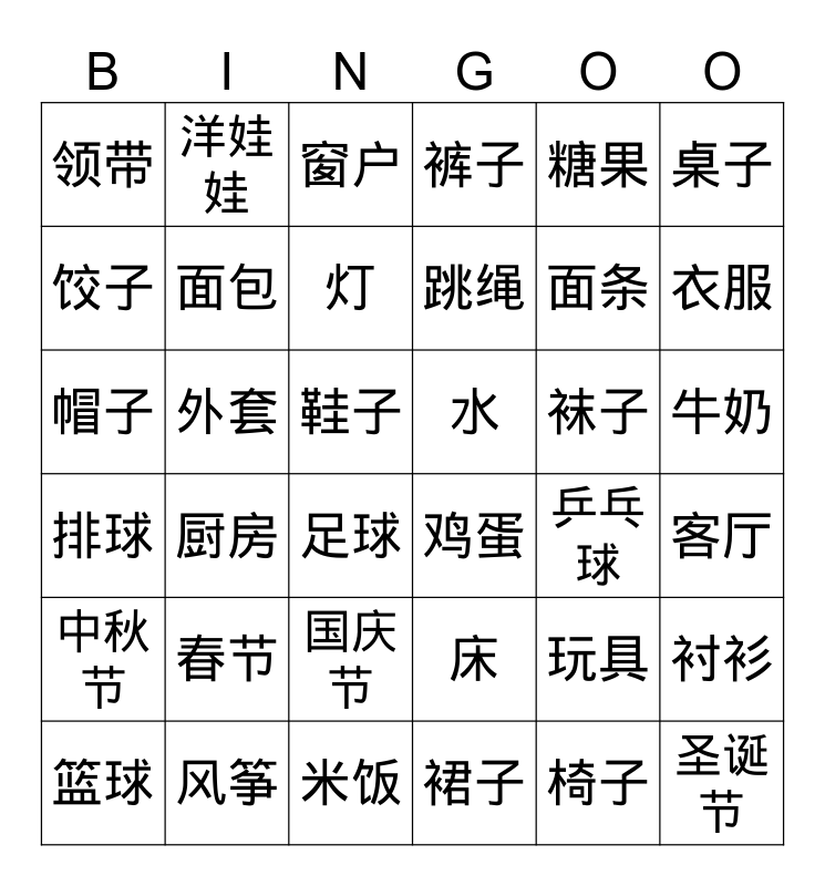 This bingo card has 40 words: 米饭, 面条, 包子, 饺子, 鸡蛋, 牛奶, 面包, 蔬菜, 糖果, 水, 衣服, 裤子, 帽子, 鞋子, 外套, 袜子, 衬衫, 领带, 裙子, 窗户, 厨房, 客厅, 灯, 桌子, 椅子, 床, 春节, 圣诞节, 中秋节, 国庆节, 情人节, 足球, 篮球, 排球, 跳绳, 乒乓球, 玩具, 风筝, 洋娃娃 and 滑冰.