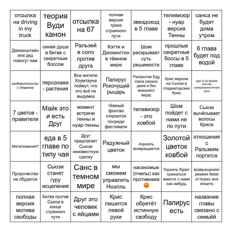 This bingo card has a free space and 62 words: Тёмный мир в "Цветочном короле", 7 цветов - правители, новые механики геймплея, персонажи - растения, название главы связано с семьёй, возвращение/ремейк fields of hopes and dreams, санса не будет дома утром, раскрытие финальной трагедии из пророчества, синяя душа в битве с секретным боссом, полная версия мотива свободы, полная версия трека странного пути, мы сможем управлять Ноэлль, телевизор - нуар версия Тенны, телевизор - это ковбой, Азгор - финальный босс в 5 главе, отсылка на driving in my truck, прошлые секретные боссы в 5 главе, звездоход в 5 главе, Азгор на нашей стороне, Джекенштейн или дед помогут нам, 6 глава будет под водой, отсылка на 67, друг в 3д форме или как суперреалистичная рука, момент встречи тенны и нуар-тенны, секция геймплея с большой командой на фестивале, Азриэль возвращается, еда в 5 главе по типу чая, тематика средневековья, Крис верхом на Сьюзи в гладиаторских боях, отношения с Ральзеем портятся, пикап Азгора - противник, Санс в темном мире, Папирус есть, Тьма поглотит мир в финале, разбирательство с Элвином, теория Вуди канон, насекомые (пчелы) как противники😡, Золотой цветок ковбой, Шом раскрывает суть решимости, Шом пойдет с нами не по пути, Кэтти и Джокингтон в тёмном мире, Ториэль будет сражаться вместе с нами как-нибудь, Все жители Хоумтауна поймут, что это всё не выдумка, Рыцарь будет говорить, Ральзей в соло против друга, Раскрытие Egg mana (можно даже и без внешнего вида), Друг предлагает Сьюзи неизвестную сделку, Битва против Сьюзи в конце странного пути, Крис лишится левой руки, Крис обретёт истинную свободу, Папирус Рокочущий рыцарь, Майк это и есть Друг, 3 биома и Замок, Сьюзи станет гуру исцеления, Дессриэль официально подтверждён, Сьюзи вычёсывает волосы Криса, Радужный цветок, Пророчество не сбудется, Друг это человек с яйцами, Можно погладить собаку, Мегалования? and Зелёный Гастер.