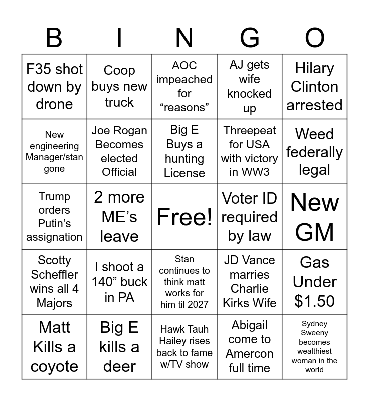 This bingo card has a free space and 24 words: I shoot a 140” buck in PA, Big E kills a deer, Big E Buys a hunting License, Matt Kills a coyote, Hilary Clinton arrested, F35 shot down by drone, New engineering Manager/stan gone, Coop buys new truck, Voter ID required by law, Stan continues to think matt works for him til 2027, Threepeat for USA with victory in WW3, Trump orders Putin’s assignation, JD Vance marries Charlie Kirks Wife, Gas Under $1.50, Joe Rogan Becomes elected Official, Abigail come to Amercon full time, New GM, AOC impeached for “reasons”, Weed federally legal, 2 more ME’s leave, Sydney Sweeny becomes wealthiest woman in the world, Scotty Scheffler wins all 4 Majors, AJ gets wife knocked up and Hawk Tauh Hailey rises back to fame w/TV show.