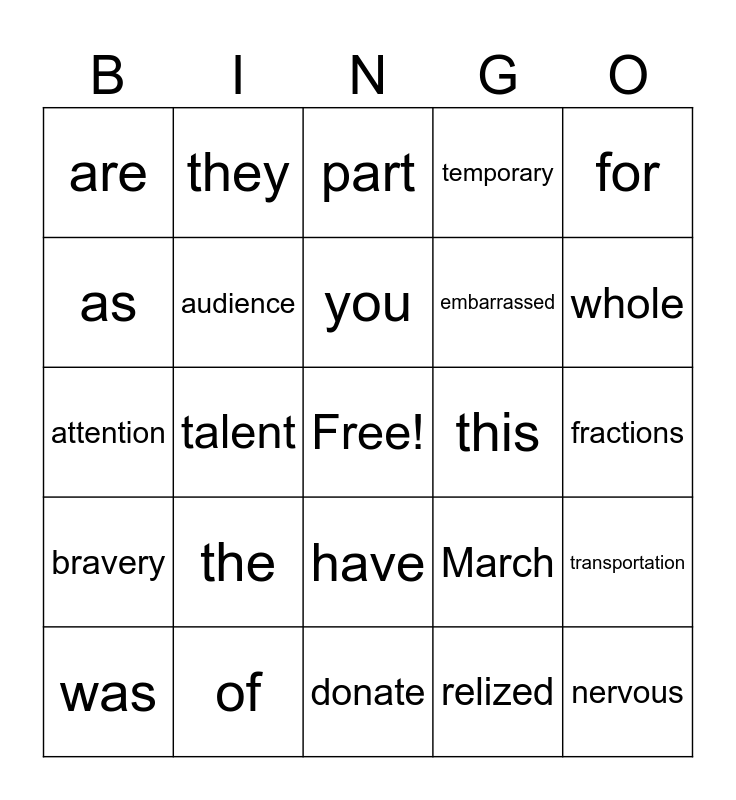 This bingo card has a free space and 24 words: the, of, you, was, for, are, as, they, this, have, embarrassed, attention, March, transportation, audience, relized, fractions, part, whole, talent, nervous, bravery, temporary and donate.