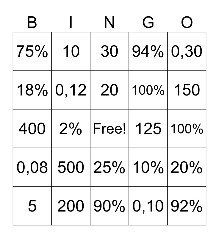 This bingo card has a free space and 34 words: 0,05, 0,10, 0,25, 0,50, 0,08, 0,12, 0,30, 5, 10, 15, 20, 30, 50, 100, 125, 150, 200, 400, 500, 10%, 25%, 50%, 75%, 100%, 90%, 92%, 94%, 99%, 100%, 18%, 15%, 2%, 20% and 75%.