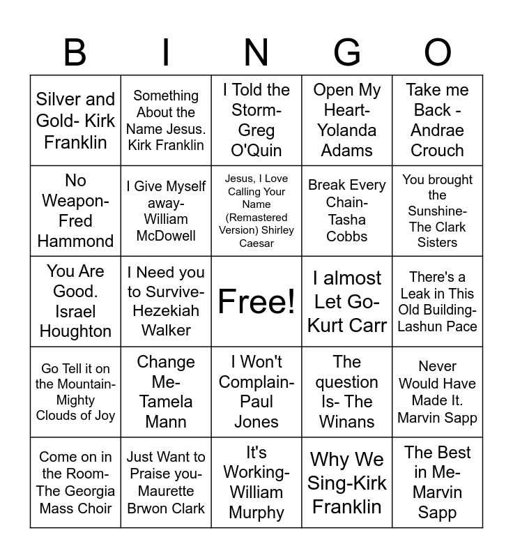 This bingo card has a free space and 29 words: Come on in the Room-The Georgia Mass Choir, God's Got a Blessing-Norman Hutchins, I Need you to Survive-Hezekiah Walker, Long as I Got King Jesus-Vickie Winans, Silver and Gold- Kirk Franklin, I Told the Storm- Greg O'Quin, I Give Myself away-William McDowell, Change Me- Tamela Mann, I almost Let Go-Kurt Carr, Just Want to Praise you-Maurette Brwon Clark, There's a Leak in This Old Building-Lashun Pace, The Best in Me-Marvin Sapp, It's Working- William Murphy, Why We Sing-Kirk Franklin, You brought the Sunshine- The Clark Sisters, Shake the Devil Off- Dorothy Norwood, I Won't Complain- Paul Jones, Go Tell it on the Mountain-Mighty Clouds of Joy, Take me Back -Andrae Crouch, You Are Good. Israel Houghton, The question Is- The Winans, He's an On Time God-Dottie Peoples, Break Every Chain- Tasha Cobbs, No Weapon- Fred Hammond, Open My Heart- Yolanda Adams, Something About the Name Jesus. Kirk Franklin, Never Would Have Made It. Marvin Sapp, Jesus, I Love Calling Your Name (Remastered Version) Shirley Caesar and Soon & Very Soon. Andrae Crouch.