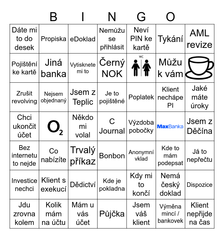 This bingo card has 4 images and 45 words: Nemá český doklad, Můžu k vám, Jsem váš klient, Jsem z Teplic, Jsem z Děčína, Propiska, Mám u vás účet, Tykání, Bonbon, AML revize, Nemůžu se přihlásit, Klient nechápe PI, Poplatek, Klient s exekucí, Pojištění ke kartě, Dispozice, Neví PIN ke kartě, Někdo mi volal, Dáte mi to do desek, Jiná banka, Jdu zrovna kolem, Vytisknete mi to, Jaké máte úroky, Kolik mám na účtu, Je to pojištěné, Nejsem objednaný, Klient nepřijde na čas, Výzdoba pobočky, Investice nechci, Dědictví, Chci ukončit účet, Anonymní vklad, Kde to mám podepsat, Já to nepřečtu, Zrušit revolving, Trvalý příkaz, Kde je pokladna, Bez internetu to nejde, C Journal, Půjčka, Černý NOK, eDoklad, Kdy mi to končí, Co nabízíte and Výměna mincí / bankovek.