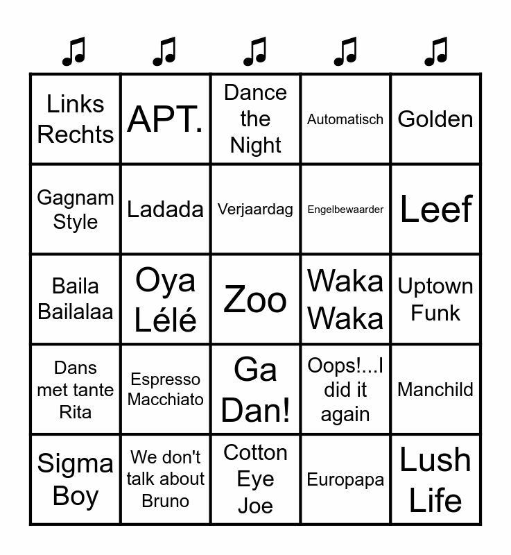 This bingo card has 30 words: We don't talk about Bruno, Daba Die Daba Daa, Oya Lélé, Macarena, Links Rechts, Dance the Night, Ladada, Ga Dan!, Waka Waka, Cotton Eye Joe, Uptown Funk, Zoo, Europapa, Lush Life, Leef, Flowers, Oops!...I did it again, Dans met tante Rita, Espresso Macchiato, Golden, Baila Bailalaa, Huisfeestje, APT., Engelbewaarder, Gagnam Style, Automatisch, Manchild, Sigma Boy, Verjaardag and What does the Fox say?.