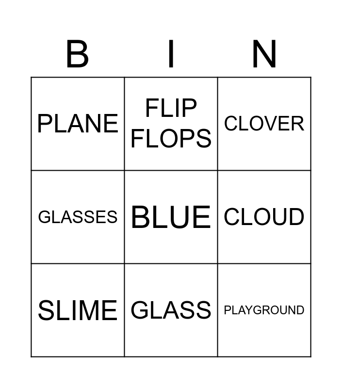 This bingo card has 20 words: Free!, CLOWN, CLOVER, SLEEP, SLOTH, BLUE, BLACK, PLANE, PLAYGROUND, FLIP FLOPS, FLY, CLOTHES, CLOUD, SLIDE, SLIME, GLUE, GLASS, GLASSES, GLITTER and FLOWER.