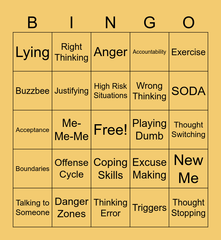 This bingo card has a free space and 31 words: Thinking Error, Minimizing, Me-Me-Me, Denial, Lying, Anger, Justifying, Excuse Making, Playing Dumb, Triggers, Thought Switching, Thought Stopping, Captain RIBEYE, 1st Mate TATER, SODA, Old Me, New Me, Offense Cycle, Boundaries, Coping Skills, Exercise, Time Out, Talking to Someone, Right Thinking, Wrong Thinking, Buzzbee, Accountability, Acceptance, Danger Zones, High Risk Situations and Positive Thinking.