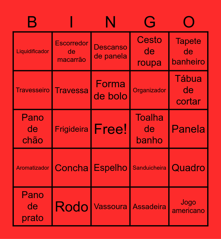 This bingo card has a free space and 40 words: Velas, Pano de chão, Jogo de copos, Travessa, Rodo, Espelho, Forma de bolo, Talheres, Tapete de banheiro, Aromatizador, Frigideira, Cesto de roupa, Jogo americano, Panela, Toalha de banho, Concha, Relógio de parede, Liquidificador, Lixeira, Descanso de panela, Quadro, Assadeira, Organizador, Travesseiro, Caneca, Jarra, Potes plásticos, Balde, Jogo de pratos, Cobertor, Espátula, Pano de prato, Açucareiro, Sanduicheira, Tábua de cortar, Vassoura, Toalha de rosto, Almofada, Escorredor de macarrão and Jogo de cama.