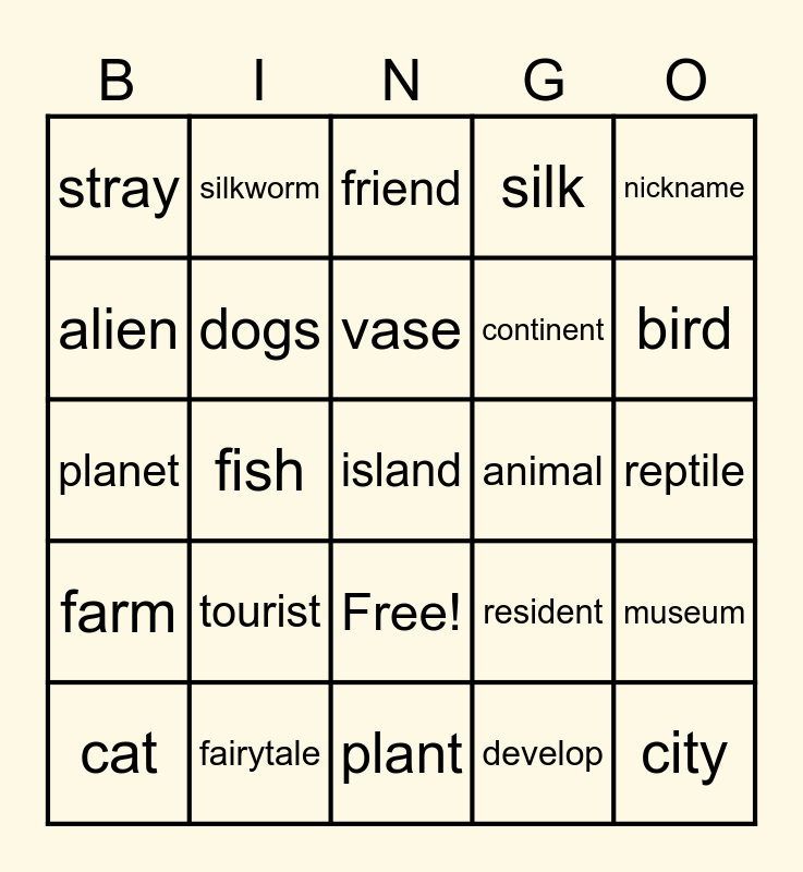 This bingo card has 26 words: Free!, develop, vase, fairytale, nickname, stray, alien, silkworm, reptile, resident, continent, planet, museum, cat, fish, mouse, silk, farm, friend, island, bird, plant, animal, tourist, dogs and city.