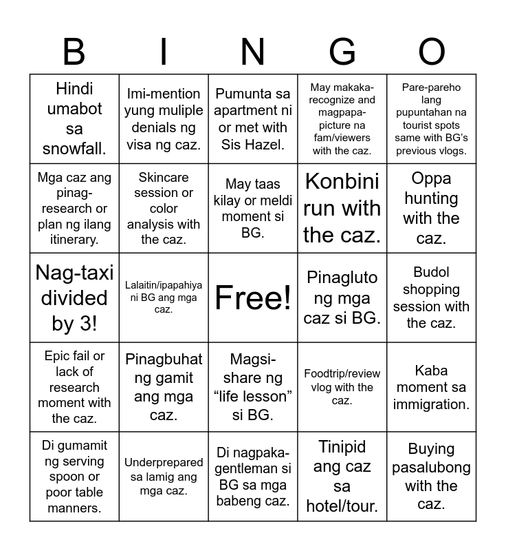 This bingo card has a free space and 24 words: Pinagbuhat ng gamit ang mga caz., Underprepared sa lamig ang mga caz., May taas kilay or meldi moment si BG., Di gumamit ng serving spoon or poor table manners., Pare-pareho lang pupuntahan na tourist spots same with BG’s previous vlogs., Hindi umabot sa snowfall., Mga caz ang pinag-research or plan ng ilang itinerary., Imi-mention yung muliple denials ng visa ng caz., Pinagluto ng mga caz si BG., Magsi-share ng “life lesson” si BG., Konbini run with the caz., Nag-taxi divided by 3!, Foodtrip/review vlog with the caz., Kaba moment sa immigration., Skincare session or color analysis with the caz., Tinipid ang caz sa hotel/tour., Budol shopping session with the caz., Pumunta sa apartment ni or met with Sis Hazel., Oppa hunting with the caz., Lalaitin/ipapahiya ni BG ang mga caz., Buying pasalubong with the caz., Epic fail or lack of research moment with the caz., May makaka-recognize and magpapa-picture na fam/viewers with the caz. and Di nagpaka-gentleman si BG sa mga babeng caz..