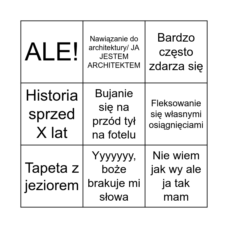 This bingo card has 9 words: Tapeta z jeziorem, Bardzo często zdarza się, Nawiązanie do architektury/ JA JESTEM ARCHITEKTEM, Historia sprzed X lat, ALE!, Fleksowanie się własnymi osiągnięciami, Bujanie się na przód tył na fotelu, Nie wiem jak wy ale ja tak mam and Yyyyyyy, boże brakuje mi słowa.