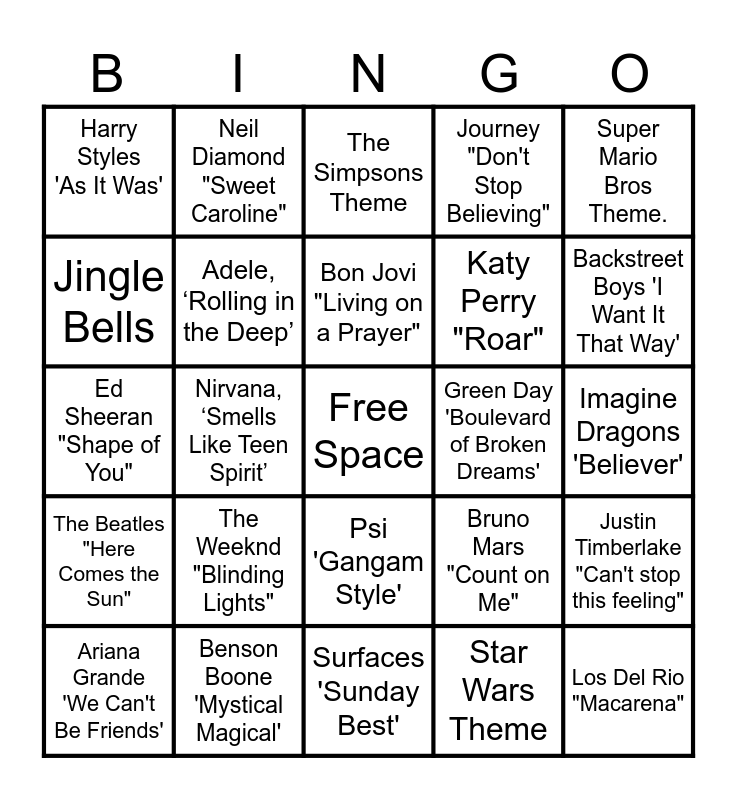 This bingo card has a free space and 29 words: Ariana Grande 'We Can't Be Friends', Carly Rae Jepson "Call Me Maybe", Nirvana, ‘Smells Like Teen Spirit’, Billie Eilish 'Bad Guy', Harry Styles 'As It Was', The Simpsons Theme, Adele, ‘Rolling in the Deep’, The Weeknd "Blinding Lights", Green Day 'Boulevard of Broken Dreams', Benson Boone 'Mystical Magical', Imagine Dragons 'Believer', Los Del Rio "Macarena", Surfaces 'Sunday Best', Star Wars Theme, Backstreet Boys 'I Want It That Way', Queen "We Will Rock You", Psi 'Gangam Style', The Beatles "Here Comes the Sun", Super Mario Bros Theme., Ed Sheeran "Shape of You", Bruno Mars "Count on Me", Taylor Swift "Shake It Off", Katy Perry "Roar", Jingle Bells, Journey "Don't Stop Believing", Neil Diamond "Sweet Caroline", Justin Timberlake "Can't stop this feeling", Bon Jovi "Living on a Prayer" and Smash Mouth "All Star".