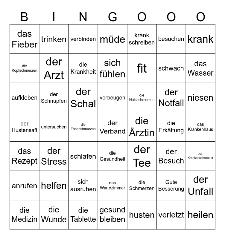 This bingo card has a free space and 55 words: husten, niesen, messen, das Fieber, untersuchen, helfen, krank, gesund, der Arzt, sich ausruhen, müde, die Krankenschwester, das Krankenhaus, die Erkältung, die Medizin, das Rezept, krank schreiben, fit, verletzt, schwach, das Wasser, der Stress, die Halsschmerzen, verbinden, das Pflaster, die Kopfschmerzen, die Zahnschmerzen, der Zahn, aufkleben, der Notfall, die Bauchschmerzen, der Besuch, der Unfall, die Wunde, besuchen, sich fühlen, anrufen, der Schnupfen, heilen, schlafen, trinken, das Wartezimmer, die Schmerzen, der Husten, der Schal, der Hustensaft, die Tablette, der Tee, die Ärztin, die Krankheit, die Gesundheit, Gute Besserung, gesund bleiben, vorbeugen and das Medikament.