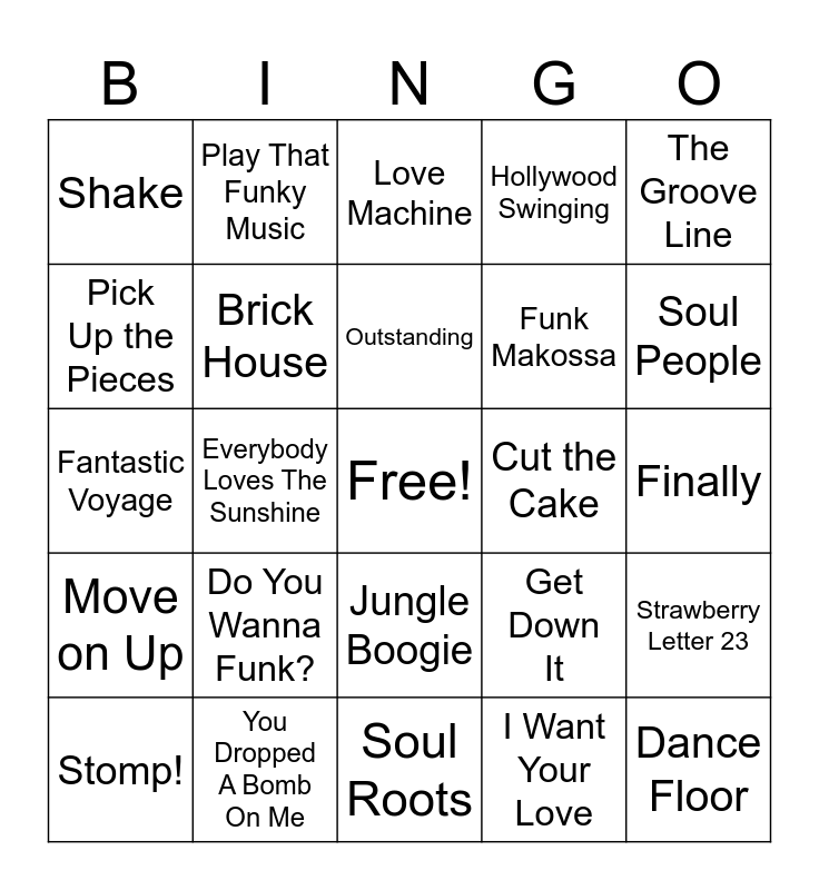 This bingo card has a free space and 35 words: Super Freak, Give Up The Funk, Flash Light, Brick House, Jungle Boogie, Hollywood Swinging, Pick Up the Pieces, Fire, Outstanding, Burn Rubber On Me, Fantastic Voyage, The Groove Line, Dazz, Get Off, Shake, Cut the Cake, I Want Your Love, Everybody Loves The Sunshine, Move on Up, Dance Floor, Get Down It, Stomp!, Strawberry Letter 23, You Dropped A Bomb On Me, Love Machine, Soul People, Funkytown, Funky And You Know It, Funk Makossa, Finally, Enjoy The Groove, Soul Roots, Do You Wanna Funk?, Play That Funky Music and Sexy.